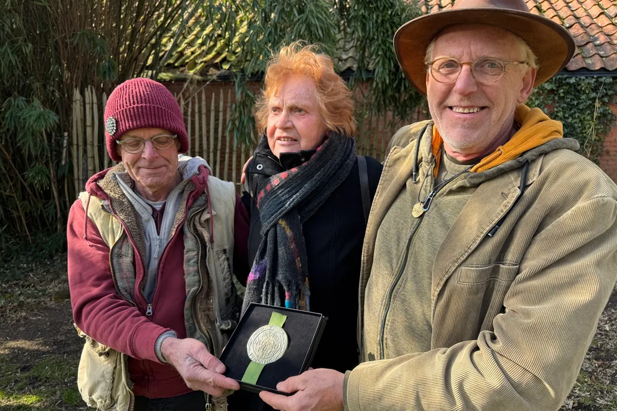 In gezelschap van 100 bevriende vakgenoten, medewerkers en klanten van het eerste uur mochten Bob Foltz en Andries Bierling de Rob Leopold Penning in ontvangst nemen als blijk van waardering voor hun verbindende inzet voor de (noordelijke) tuincultuur. Dit jaar bestaat hun Kwekerij Tuingoed Foltz in Meeden 25 jaar. De penning werd overhandigd door Ansje Leopold-Teunissen, de weduwe van Rob Leopold.
